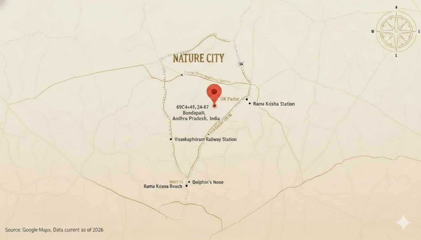 The Nature City Spreads across 90 RERA-approved acres in Bondapalli, Vizianagaram. Welcome to India's most adventurous gated community, featuring IGBC Platinum-certified living and a Miyawaki Forest.